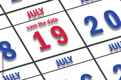 july 19th. Day 19 of month, Date marked Save the Date on a calendar. summer month, day of the year concept