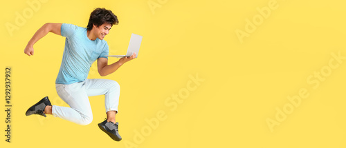 Jumping male Asian programmer with laptop on color background