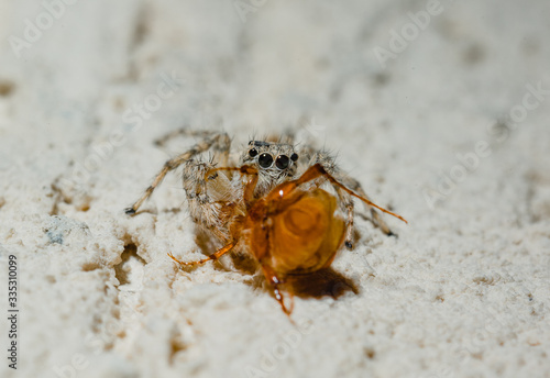 Jumping Spider eat Soldier fly or Oplodontha viridula on Nature.