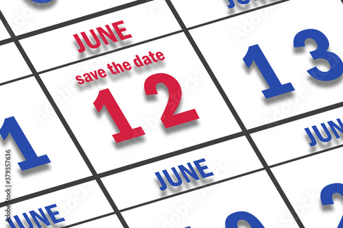 june 12th. Day 12 of month, Date marked Save the Date on a calendar. summer month, day of the year concept