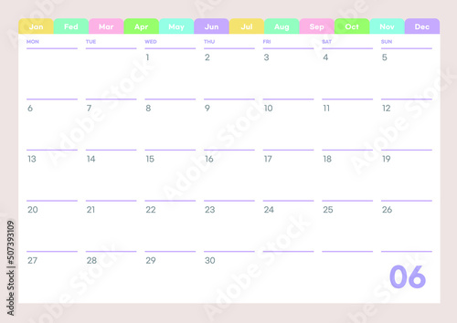 June 2022 cute design digital and printable calendar template illustration. Notes, scheduler, diary, calendar, memo, planner document template background.