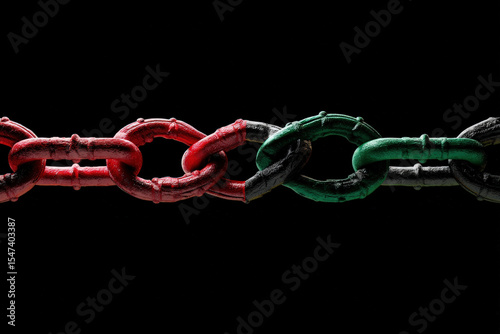 Juneteenth Freedom Chain. A chain representing Juneteenth, with red, black, and green links against a black background, symbolizing freedom and heritage.