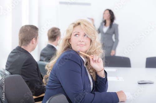 Junge Frau im Blazer langweilt sich im Seminar