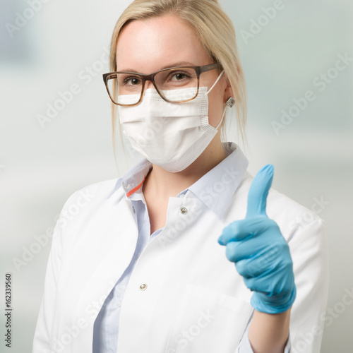Junge hübsche Ärztin mit Mundschutz zeigt Daumen hoch