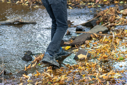 Junge mit schwarzer Hose und Wanderschuhen überquert einen Fluss über einen kleinen Damm aus Steinen und balanciert über glitschige Steine und Blätter und bekommt nasse Füße aber hat draußen viel Spaß