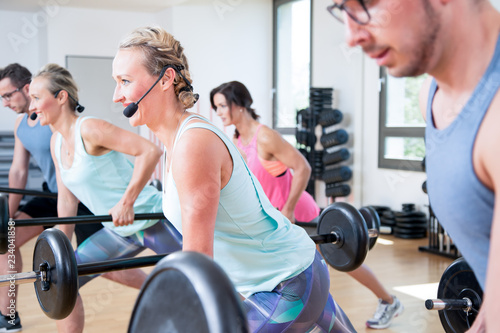 junge Sportgruppe trainiert Aerobik Pump mit Langhantel im Fitnessstudio