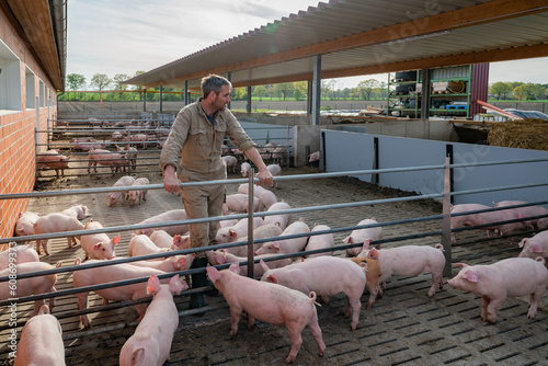 Junger Landwirt schaut nach seinen Schweinen, in den aussen Buchten seines Betriebes, dieser Betrieb hat die Haltungsstufe 4.