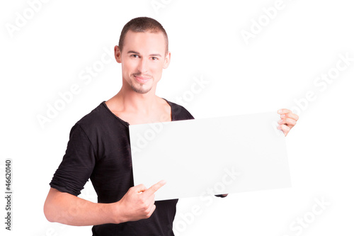 Junger Mann zeigt auf hellgraue Tafel