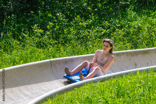 Junges Mädchen befährt eine Sommerrodelbahn mit einem Schlitten