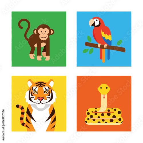 Jungle Animals Monkey, Parrot, Tiger, Snake Illustration