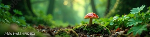 Jungle floor with a small wild mushroom in the center, greenery, wildlife