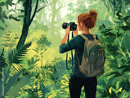 Jungle Photographer: A young woman with a backpack takes photographs in a lush, green jungle. Sunlight filters through the dense canopy, illuminating the vibrant foliage.