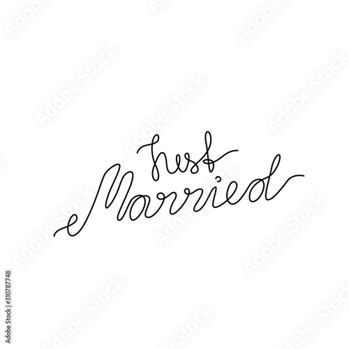 Just married, lettering phrase, continuous line drawing, design element for poster, banner, card, print for clothes, emblem or logo design, one single line, isolated vector illustration.