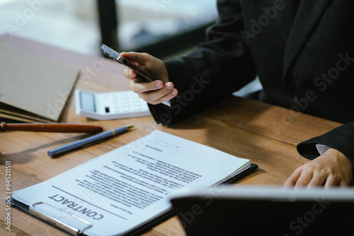 Justice and law concept. male judge in a courtroom with the gavel working with digital tablet computer and smartphone on wood table.