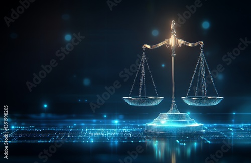 Justice scales shine a light on a tech circuit board. Virtual legal tech navigates the crossroads of law and technology. Automation affects courtroom environments, digital evidence, and judicial