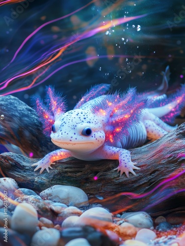 Juvenile axolotl in a colorful aquatic habitat underwater environment nature photography exotic pet concept