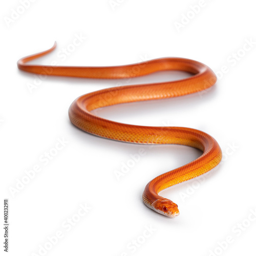 Juvinile Amel Motley Striped Cornsnake aka Elaphe guttataon snake. Isolated on white background.Juvinile Cornsnake on white background