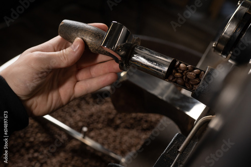 Kaffee Probenzieher wird aus Kaffeeröster gezogen und die Bohnen kontrolliert