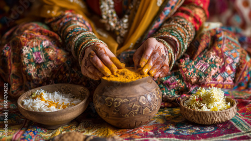 Kalasha Puja, Woman preparing Kalasha with turmeric, kumkum, and rice during Vedic ritual, close-up of hands