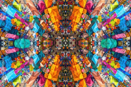 Kaleidoscopic view of a vibrant market scene, abstract and colorful, ideal for a cultural theme.