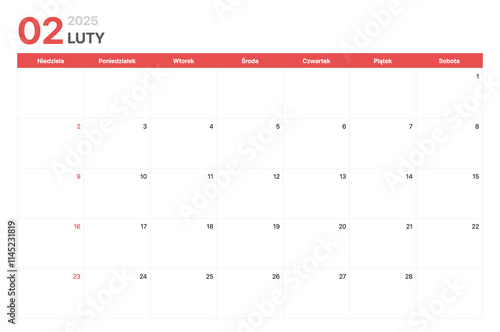 Kalendarz 2025. Tydzień kalendarzowy 2025 zaczyna się w niedziele. Korporacyjny minimalistyczny pusty kalendarz na Luty 2025