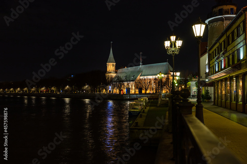 KALININGRAD, RUSSIA - MARCH 12, 2021: Konigsberg Cathedral (circa 1333) on Kant Island (formerly Kneiphof) of the Pregel (Pregolya) River at night.