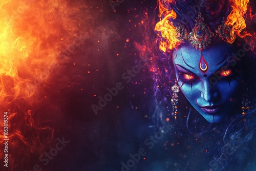 Kali’s power: depiction of goddess Kali, embodying fierce energy, transformative strength, representing role as destroyer of evil, symbol of liberation, divine feminine power.