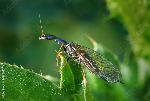 Kamelhalsfliege (Raphidioptera) Weibchen auf einem grünen Blatt mit dornigen Spitzen - Baden-Württemberg, Deutschland