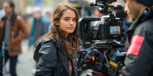 Kamerafrau beim Filmen am Set im Hintergrund