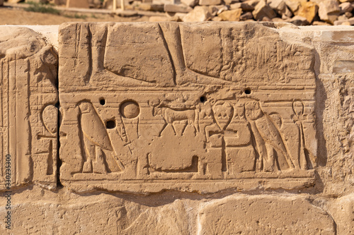 Karnak Temple, complex of Amun-Re. Embossed hieroglyphics on walls. Luxor Governorate, Egypt.