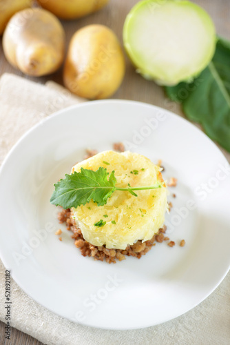 Kartoffelbrei auf Kohlrabi und Sojagehacktem