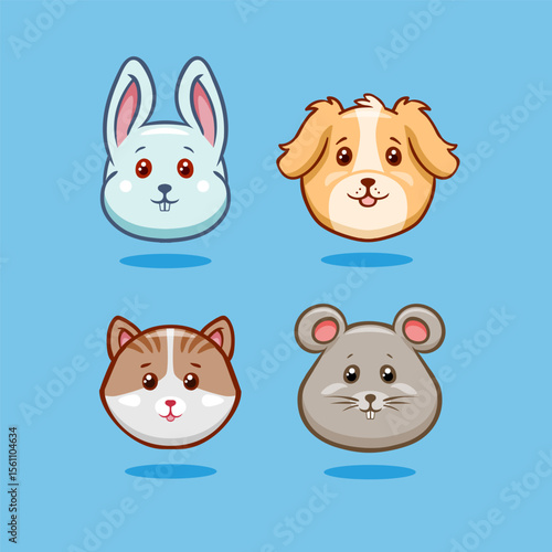 Kawaii Animals Head Set Vector Cartoon Characters. Rabbit, dog, cat and mouse cartoon animals collection isolated vector illustration.
