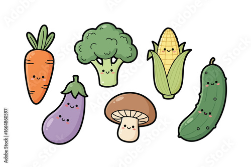 Kawaii cartoon vegetables and mushroom characters with smiling faces carrot