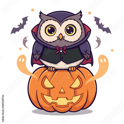 Kawaii Halloween owl character with cape and bow tie perched on carved pumpkin bats flying around illustration