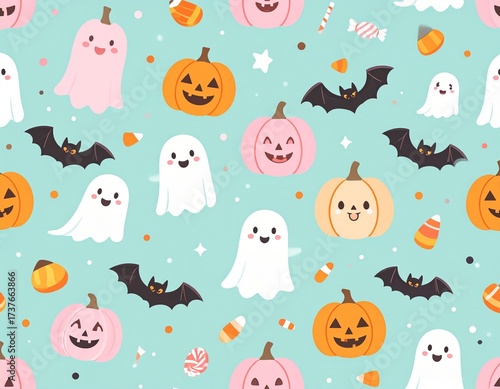 Kawaii Halloween Seamless Pattern with Cute Pumpkins, Ghosts, and Candy