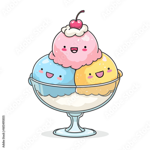 Kawaii Ice Cream Sundae with Smiling Scoops and Cherry