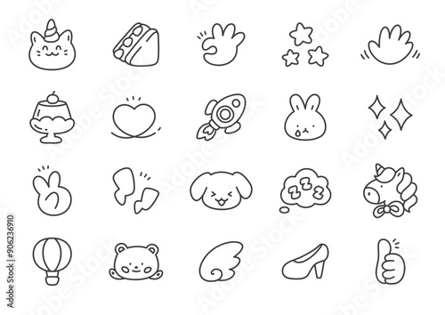 Kawaii icon set. Collection of cute hand drawn monochrome illustrations (sparkles, strawberry sandwich, space ship, little lightnings, puppy etc.) isolated on a white background. Vector 10 EPS.