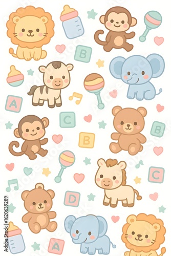 Kawaii Jungle Animal and Baby Toy Pattern – Seamless Pastel Kids Design
