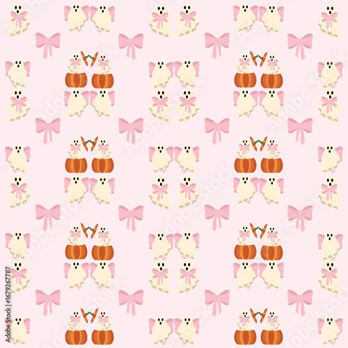 Kawaii Pastel Halloween Pattern with Ghosts, Pumpkins and Pink Bows Seamless Digital Background