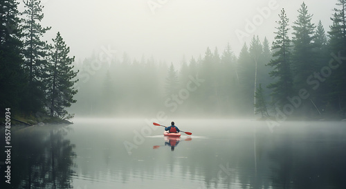 Kayak in Misty Lake Surrounded by Pines