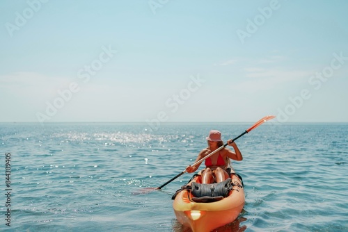 Kayak sea woman. Happy attractive woman with long hair in red swimsuit, swimming on kayak. Summer holiday vacation and travel concept.