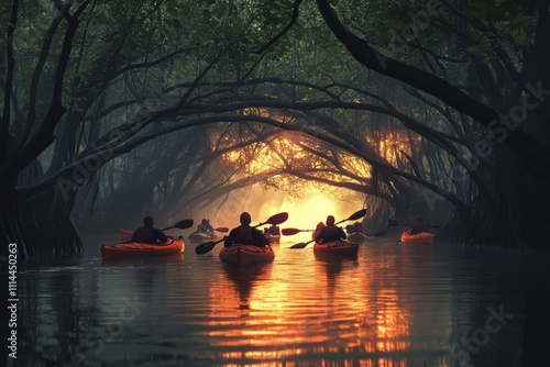 Kayakers paddling through a serene mangrove at sunset. Generative AI