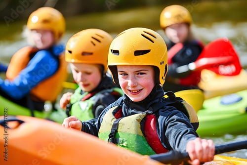 Kayakers smile in vivid helmets, enjoying a sunny river adventure