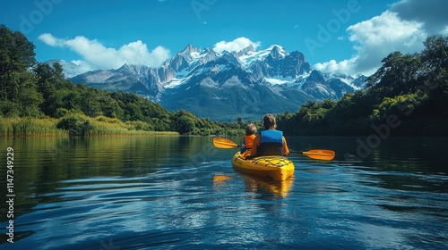 Kayaking on a serene lake with majestic snow-capped mountains in the background.
