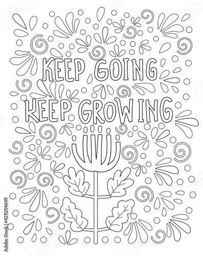 Keep going, keep growing. Hand drawn coloring page for kids and adults. Unique inspirational quote. Lettering illustration, text card, poster or lettering print. Coloring book picture