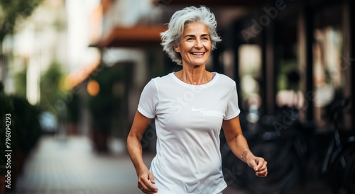 Keeping in shape at 60. Smiling middle-aged woman during a jog in the city