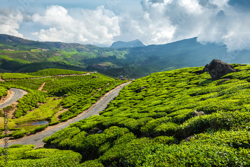 Kerala India travel background - road in green tea plantations in mountains in Munnar, Kerala, India