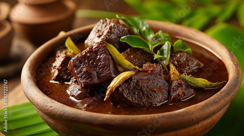 Kerala-style beef curry with roasted coconut, black pepper, curry leaves, thick dark brown gravy