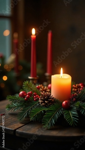Kerzen und Tannenzweige in einem Weihnachtskorb, decoration, seasonal, advent