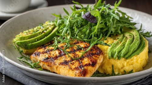 Keto friendly low carb breakfast plate concept. Delicious grilled salmon with creamy avocado and fresh greens.